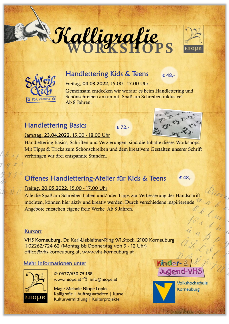 Im SchreibClub geht es um Spaß & Freude am Schreiben und um das fantasievolle Gestalten mit Schrift. Es wird gebastelt, gemalt, gezeichnet und natürlich mit den unterschiedlichsten Werkzeugen geschrieben! Nebenbei lernen die Kinder verschiedene Schriftarten sowie deren Form und Proportionen kennen. Für Kinder ab der zweiten Klasse Volksschule. Für die Mittelschule / Unter- und Oberstufe werden die Inhalte altersgerecht angepasst.