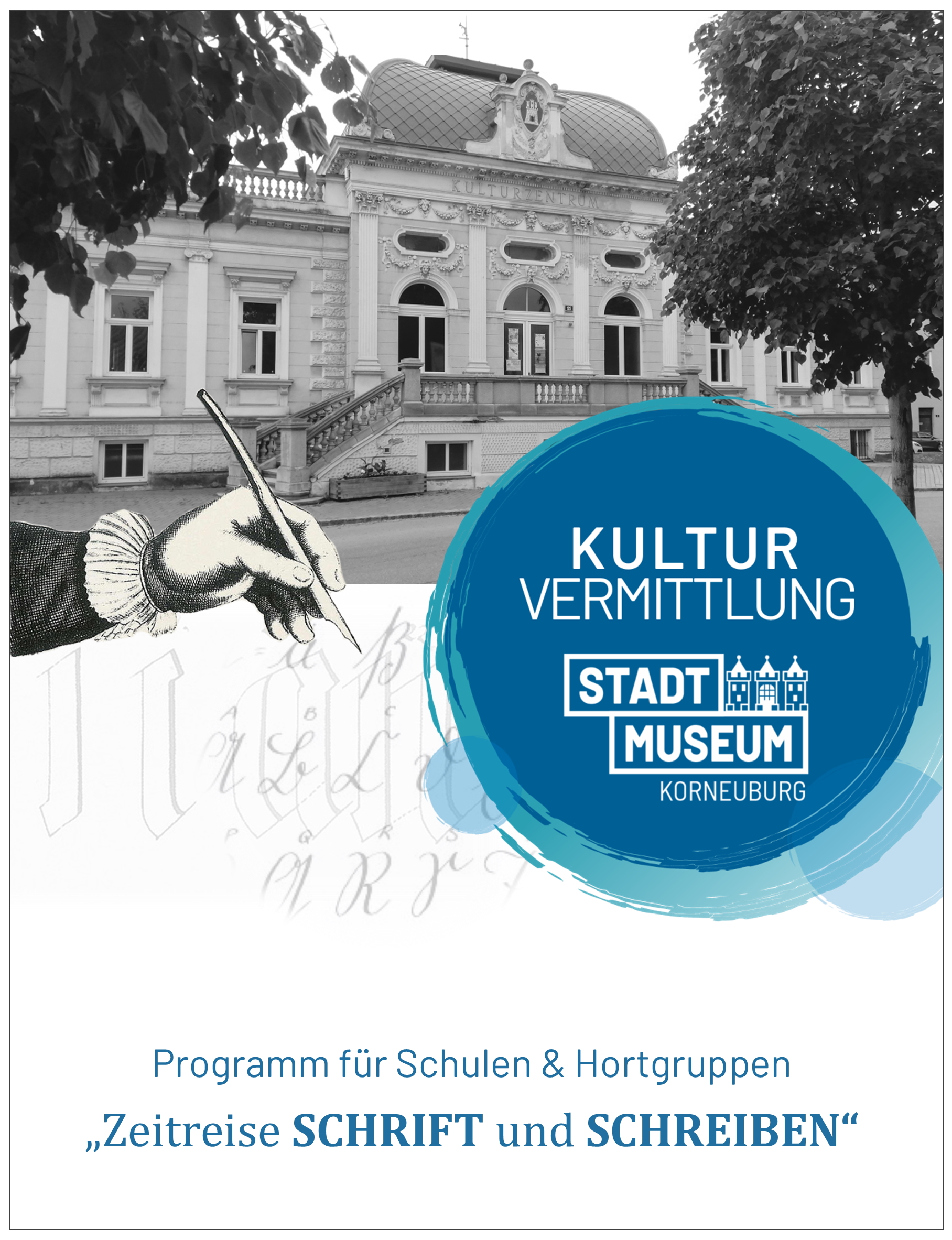 "Zeitreise SCHRIFT und SCHREIBEN" ist ein gefördertes Kulturvermittlungsprogramm im Stadtmuseum Korneuburg. Es dient der Bewusstseinsbildung zum Thema der Entwicklung der Schrift und stellt einen Bezug zu unserem heutigen Verständnis von Schrift und Schreiben dar. Durch Erzählungen, Spiele und Aufgaben eigenen sich Schüler*innen Wissen um historische und zeitgenössische Schriften an. In den anschließenden Workshops wird Schrift und Schreiben anders, kreativ und mit einem historischen Hintergrundwissen erlebt.